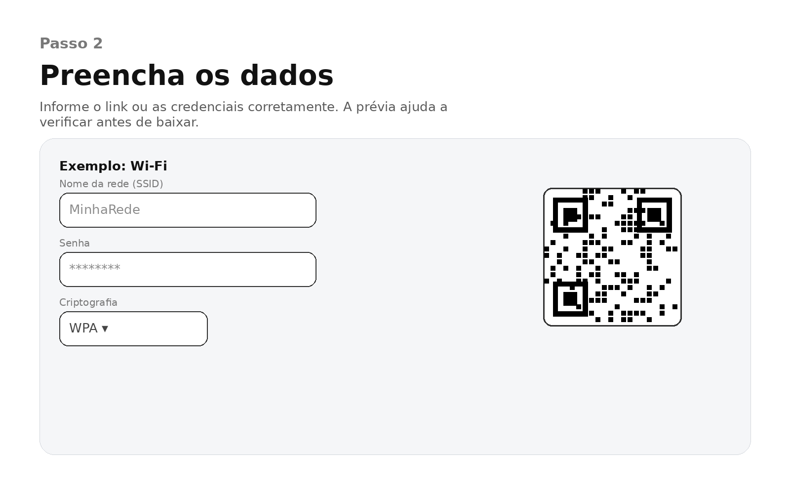 URL, Wi-Fi, WhatsApp ou Pix. Cada tipo tem campos específicos.